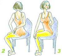 (右)坐姿转背姿势法:坐在椅子上,右手扶左膝关节,左手扶在背后或右髋关节上,吸气时转体,静止15-30秒,自然呼吸,然后还原呼气。左右各做四次。