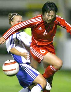 但第23分钟风云突变,芬兰队传球吊至中国队禁区内,李冬娜手球犯规,主裁判不仅出示红牌将李冬娜罚下场,还判给芬兰队一个点球。芬兰队长一蹴而就,1-0。随后,主裁判的判罚明显对中国队不利。两分钟后又向出击的门将张艳茹出示一张黄牌。王海鸣无奈变阵,将张颖调至右路,改打432阵型。