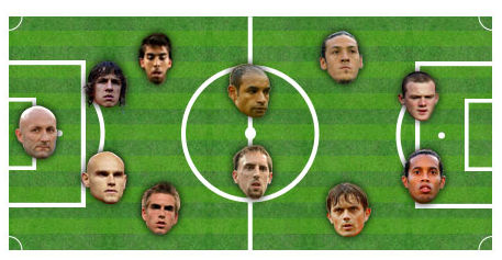 在足坛丑星网评出的欧洲足坛年度最丑陋阵容当中,不少大牌球员入围,其中罗纳尔迪尼奥和鲁尼领衔前锋线。