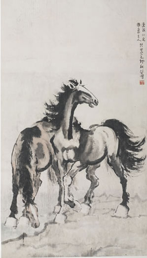 此幅作品来自于新加坡悲鸿先生的生前挚友,现仍健在的九十四岁高龄的 吕国豪 女士及其家族。 吕国豪 女士现仍珍藏的悲鸿先生在星洲为其夫妇精心制作的巨幅双人油画肖像( 吕 女士与其夫 曾沧海 先生),更是大师作品中至为珍贵的杰作。 2001 年翰海春季拍卖会推出的二十五件 徐悲鸿 先生的精品佳作,就来自于曾沧海,吕国豪夫妇。作为 徐悲鸿 先生的《双骏图》,画中双骏神采奕奕,一匹高头大马昂首远视,另一匹骏马俯首饮水,一动一静,构图之巧妙立现一代大师之风采。骏马,已见悲鸿先生将西法用于国画的大胆尝试,透视感具佳。此件作品为悲鸿先生送与新加坡曾沧海和吕国豪夫妇之作品。(来源:luxee.com)