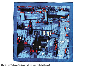 如果从巴黎这座时尚都市的天空中俯瞰,会看到怎样的景色?这款“巴黎屋顶”丝巾就描绘了人们很少能够见到的巴黎屋顶景色。同样的图案款式,但是配上了代表白天的白色和代表黑夜的蓝色两种底色,便出现了迥然不同的面貌。