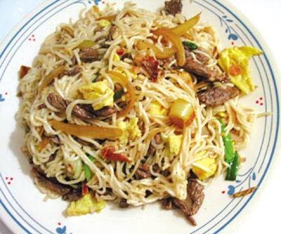 制法: 1、将猪瘦肉、火腿肠、红尖椒、香菇分别切成丝,备用。 2、按通常方法将方便面用沸水泡好,放入冷水中浸泡一下,沥干水备用。方便面千万不要泡过头,否则炒起来容易碎。 3、锅上火,油烧热,将肉丝、火腿丝、尖椒丝、香菇丝放入炒熟,再加入泡好的面一起炒。 4、将随面附带料包的一半加入少许酱油、清水搅匀,倒入锅中炒匀即可。
