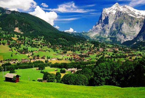 斜坡上还是星星点点的民舍,草坪修剪得很整齐。由于正值最好的瑞士夏天,山谷里还飘着彩虹伞、热气球。西边山谷上有搭乘少女峰火车的一个半山腰车站,当然你也可以直接在格林德瓦站搭乘。不同的是,这里可以直接上至欧洲高峰之一的Schithorn。在Schithorn上可远眺瑞士传说中天使居住的地方少女峰、以及并排的艾格峰和僧侣峰。少女峰寂寞地沉睡了千年,但始终等不到僧侣,所以天使就让她犹抱琵琶半遮面般云蒸霞蔚,因为一直并且永远要等待,所以一定要选择最优雅的方式。