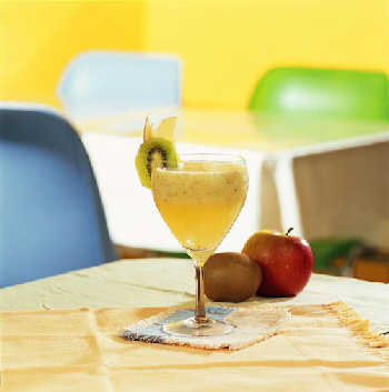 2个猕猴桃、4只橙子、1个绿柠檬所组成的新鲜果汁中含有丰富的维生素C,非常美容。