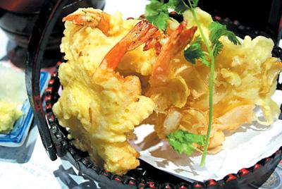 说到食物特色,店家自然比其它普通料理店更花心思。在日本料理方面,首先一款百合虾天妇罗(特价38元)就把中日元素结合了起来,一片片的鲜百合镶嵌在大虾身上,口感爽中带甜,浓郁虾香味。