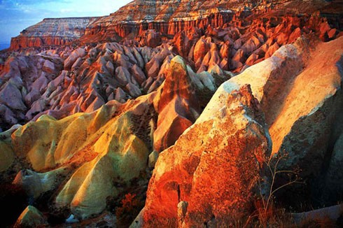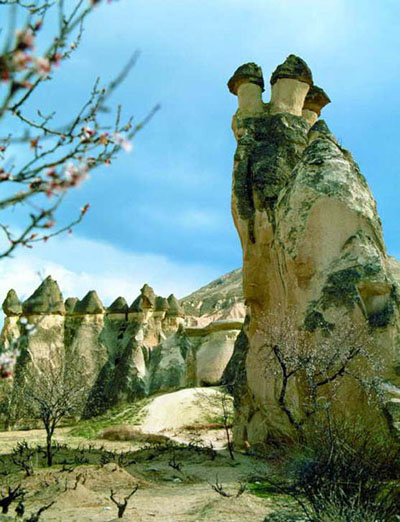 这一幅千变万化的岩石立体画,彷佛是月球的表面,横空铺展在4000平方公里的土地上。据说,这奇特的地形是火山和侵蚀作用形成的。位于卡帕多西亚地区的埃尔吉亚斯山曾经是一座活火山。火山的多次喷发,使得周围地区完全被凝灰岩覆盖,形成了泥浆和灰烬堆积而成的厚厚岩层。熔岩遮盖了凝灰岩,雨水洪水洗刷了容颜表面创造出深谷和岩石裂隙,而斜坡的地方则被刻画成形状惊人的锥体和柱子,加上风力的鬼斧神工,便将其雕刻成我们现在称之为“仙人烟囱”的奇特地貌。