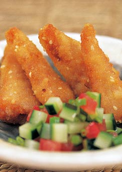 2. 将拌匀的鸡蓉做成三角形入锅炸至色泽金黄,与腌好的黄瓜一通装盘即可。