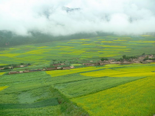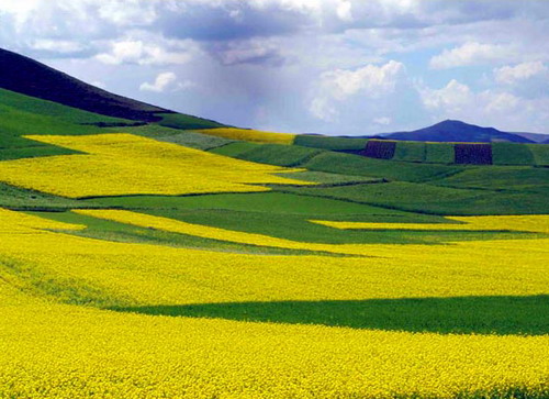 青海海北藏族自治州的门源县是西北地区的主要油料产区,这儿的油菜花同样繁盛而壮美。每年的7月是花开季节,西起青石嘴,东到玉隆滩,北到与甘肃交界的冷龙岭,南到大坂山,油菜花绵延几十公里,宛如金黄的大海。由于田地多向着河道方向倾斜,所以站在河岸上向两边看,铺天盖地的都是金黄色,大通河在中间流淌,这种景色就像镶了两道金边的银丝带蜿蜒飘舞,与祁连山遥相辉映。