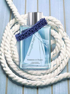 2007年夏天Essenza di Zegna推出的夏季海洋限量版香水,以完全透明的瓶身向帆船世界致敬的企图心,从瓶中散发出光泽的冰蓝色液体展现海洋与天际合而为一的夏日气氛,外包装并以三艘航行于渐层蓝的船为装饰,也延续着地中海帆船竞赛的精神。香氛部份,特别选用能振奋精神的清凉香味铺陈,前调以薄荷、欧薄荷、以及绿薄荷的清新凉爽感,即刻展现出香氛泌凉本质;中调结合热情辛香的小荳蔻、狂野辛辣的鼠尾草、及地中海独特的长春花等香调;再搭配基调温暖的木质香气,由挑动的香根草及能抚慰心灵的琥珀香调,将这款香氛优雅兼具阳刚的意念发挥至极致,创造出一种地中海夏季全然纯净的独特清新嗅觉体验。