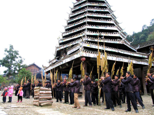 随着振动脚下土地的土炮声,领导的车队停在寨子门口,姑娘们上前祝酒,小伙子们吹起了芦笙。滴滴嗒嗒、文儿了瓦拉!一群领导们在姑娘们的簇拥下,走进了寨子。寨子里面的每个鼓楼下,都聚集了专门来表演的演员们。