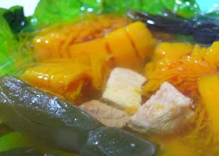 功能:南瓜味甘、性寒,含维生素B、C,营养丰富,能充饥去热、除虫、定喘,加海带可以减肥,去脂肪胆固醇,降低血压;肥胖兼有高血压者,可常饮此汤,更胜服药。