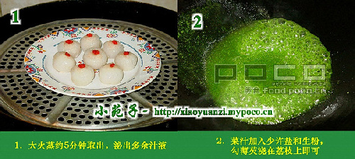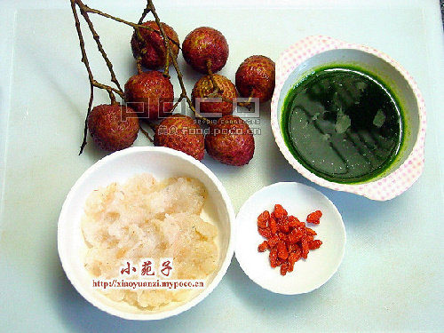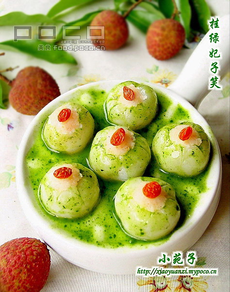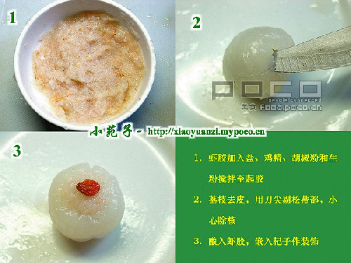 材料:荔枝、虾胶、菠菜汁、杞子(泡软)