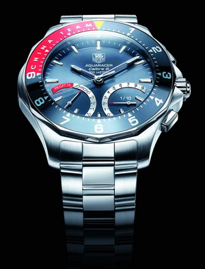 竞潜系列 Calibre S 计时码表“中国之队限量版”,为了庆祝与美洲杯帆船赛中国之队首次合作共同演绎海上运动的魅力与激情,限量推出了2000只。通过按表冠从标准时间模式转换到计时码表或倒计时模式,按一次转到计时码表模式,按两次转到倒计时模式。铝制表圈装饰有红黄两种中国之队特有颜色,并在底盖上印有中国代表队的龙形图案。
