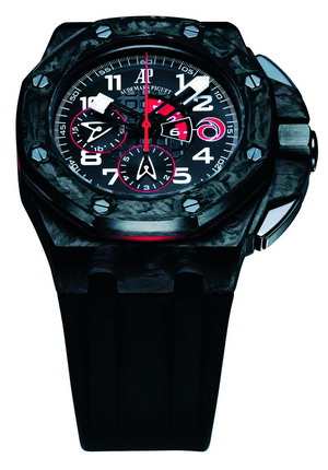 为了赞颂Alinghi帆船队伍再度挑战2007年的冠军宝座,AP表厂推出了一款全新限量表:皇家橡树离岸型Alinghi Team计时码表,限量2007只。特别采用革命性材质——锻造碳作为表壳材质,极具耐用性、非常轻盈。具有飞返计时码表及10分钟倒数定时器的功能。6点钟位置的6小时定时器和9点钟位置的20分钟定时器均配以船首形中空指针,并具有红色外圈。火红色Alinghi队徽标志则位于3点钟位置。