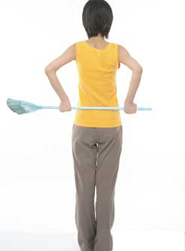 握扫把两端在后腰上下来回滚动按压,能将脂肪压碎而进入血管被分解掉。