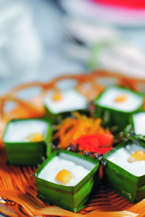 仿肉食品曾经是皇帝在斋戒日食用的“御膳”。在嘉禾园,用大豆蛋白和魔芋制作的各种山珍海味样样都有,同时真正的素味菜肴则更丰富。荷塘碧波,名副其实是包在荷叶里制作而成的,里面包着藕、西兰花等丰富蔬菜,因为是蒸菜所以菜里的油使用的很少,并且除了蔬菜的清味之外还增加了许多荷叶的芳香,是开胃、瘦身的佳肴。还有些很有意境的菜,单观赏一番便已经清凉一下,香绕人间就是如此。菜品仿造杭州名菜龙井虾人的扮相,一杯绿茶扣在菜盘当中,茶叶逐渐舒展茶汤色彩碧绿,配合魔芋做的海螺肉,仿佛一片波涛上的绿色仙境。