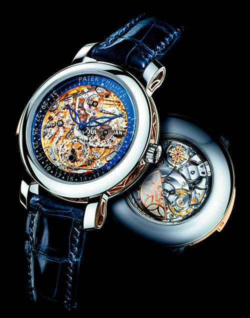 百达翡丽(PATEK PHILIPPE)5104自动机械万年历三问表。18K白金/玫瑰金表壳,鳄鱼皮表带;盘面有星期、月份、日期、平闰年、月相盈亏以及小秒针显示;整表运用镂空技术,所有功能小表盘采用水晶碟片;具有三问报时功能。年产量2枚。