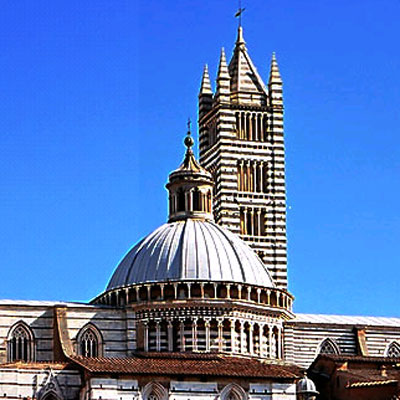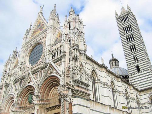 锡耶纳城市很小,历史很老,它的奠基人是罗马城的奠基人罗慕路斯ROMULUS的兄弟,一起由母狼养活的瑞慕斯REMUS的两个儿子。所以母狼也是锡耶纳城的徽记。和罗马城一样,12世纪锡耶纳就成立了共和国,商业和银行业很繁荣,为保卫独立,不断进行艰苦甚至悲壮的战争。整个中世纪,意大利北部和中部战乱不断,所以城市都重视防御,有些城市本来就从军事要塞发展而成,它们大多据险而建。锡耶纳这座小城就造再三个小山冈上,以三条山脊的交点为市中心,它东边是市政广场,西边是主教堂。