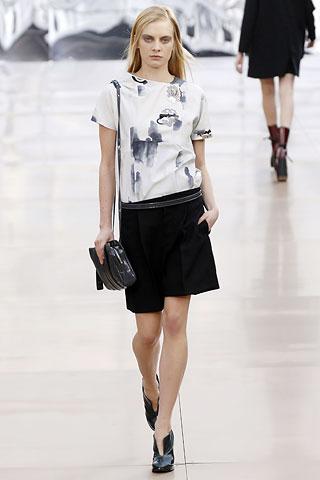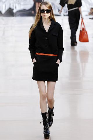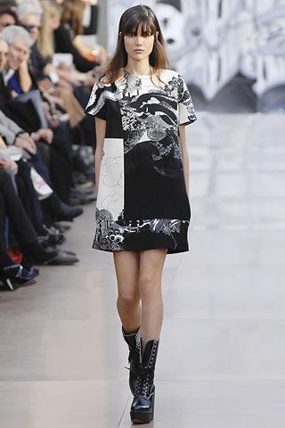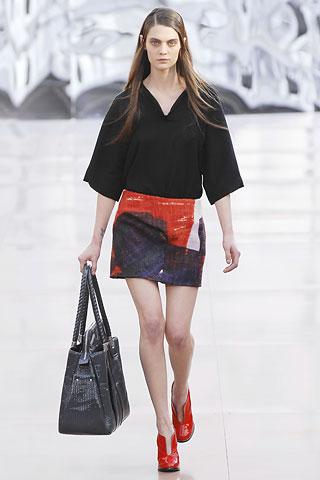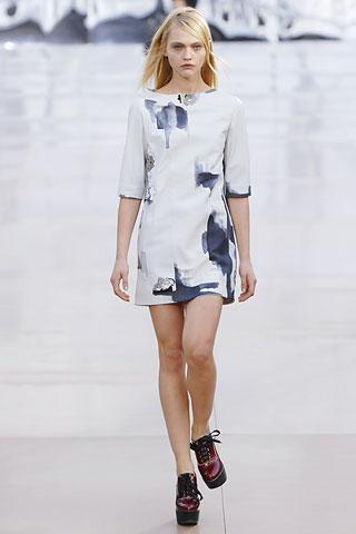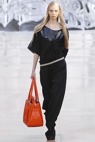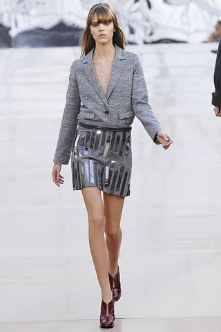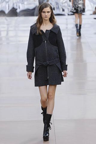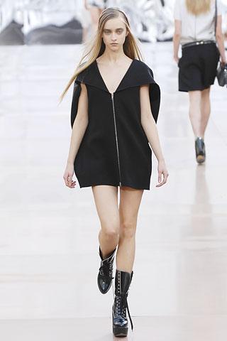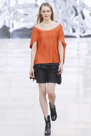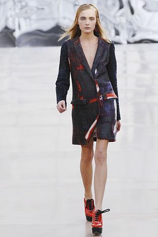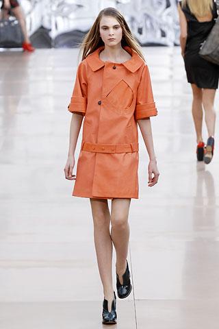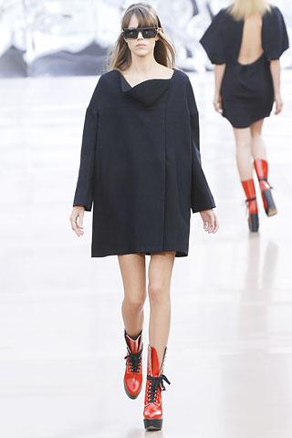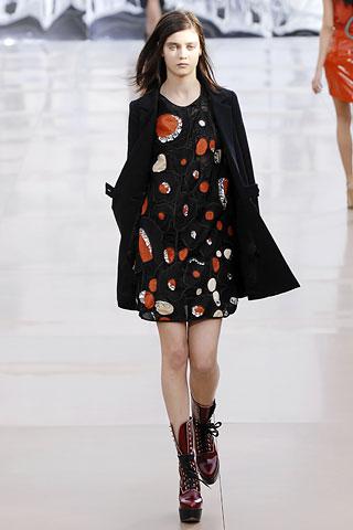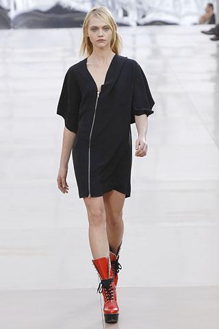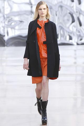 虽然背景的幕板上涂抹着类似魅影的诡异图案,但亮相台上的作品却并非从属另类路线,反而以简朴、明净、舒爽的素材用料试图舒缓一下冬日的臃肿之感。Gemma Ward身上套着不合比例的拉链开襟薄质外衣,膝上的长度是灵活搭配的关键,单件穿着是性感的活力女郎,套穿也不失怡然大方。尼龙面料的反光效果十分有跨时空的意味,设计师更是积极调用十分抢眼的果橙和艳红来重温了一下俗艳的感召力。