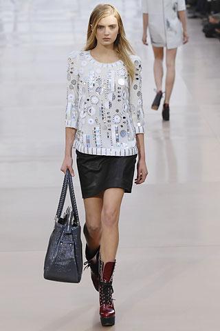 非常有趣的是竟然还可以见到久违的工作服的影子,前襟后背的线条都平整顺直得规规矩矩,但两颗调皮的纽扣,一道搭扣的衣襟,宽阔的折袖和斜裁的大口袋,一点一点地把古灵精怪的小把戏堆砌上去。袖口不对称的裁口,领口圆滑优雅的分叉线,迷你连衣裙的荷叶飘摆,几何维度的魅力原来可以将心思拨弄得这般欢快若狂。光芒闪耀的金属长条亮片缀满在裙摆前幅上,穿着于派对场合既不会太过张扬,也绝不黯然失色。楔形鞋子厚重沉稳又颇具气质的造型将复古情结反复催生,傲人的木质底跟挺拔了脚部线条,更是女人妩媚尽显的立足之点。