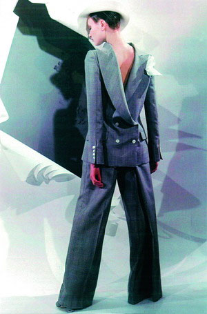 第一次世界大战后,女性开始自主独立,敢于驾驶自己的座驾、参与喜爱的运动、尽情体验旅游的乐趣。在时装设计师的推波助澜下,女士服装出现翻天覆地的变革,为了舒适和方便,更大胆借用男装的款式,裤子瞬间成为女士的恩物。衣料方面亦一样,在30年代末及第二次世界大战后,部分男士西装专用的衣料也可见于优雅的女装身上。