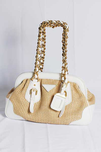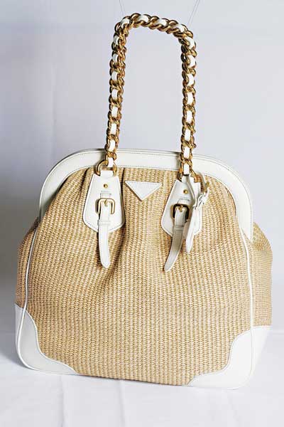 Prada人造纤维手袋系列于上个夏季已曝光,但这次醒神的白色系列,弃用银色铁三角logo,换以木制倒三角,跟白色袋身极相衬,加上麻绳手柄,已告诉大家她就是夏天的代表,同系列内同样有锁链手挽款式。