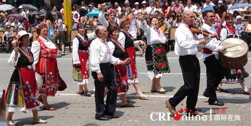 说起彩装游行,世界上许多国家都有。除了在行进队伍中可以看到鲜艳的民族服装、独特的驱鬼舞蹈、抛撒玫瑰花瓣的少女、凶悍的国王、温柔的王后和美丽的玫瑰小姐这些基本彩装游行元素外,我觉得保加利亚的玫瑰节彩装游行还是有些特点。