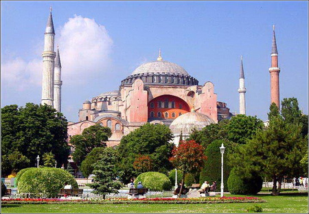 也许6月对于伊斯坦布尔来说是特别的,曾是当时世界上最大教堂的圣索菲亚大教堂正是在公元1453 年6 月成就了它历史的转变——成为象征东正教荣耀的清真寺。当时,奥斯曼土耳其的苏丹穆罕默德攻下君士坦丁堡后,移走了圣索菲亚大教堂中的祭坛、基督教圣像和遗物,并用漆涂掉马赛克镶嵌画,代之以星月、可兰经读经台、往麦加朝拜的朝拜龛、增建回教尖塔,在他宽大的命令下,建筑师锡南在使圣索非亚大教堂在几乎是保持原状的情况下变成了一座清真寺,而不是彻底的毁灭。两个不同宗教的图腾都完整的共存了下来。走进圣索菲亚宏大而高遥的殿堂,几乎会忘记呼吸,五十米之上的华彩圆顶需要你仰视才能看到,从不同方向、高度的几百个天窗里射进来的光线,让整个大厅笼罩着神圣的光芒。
