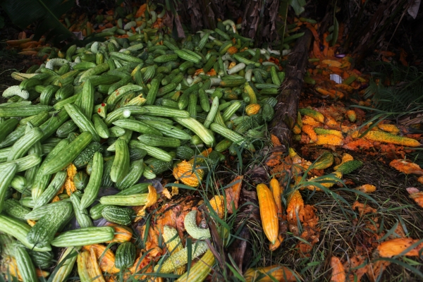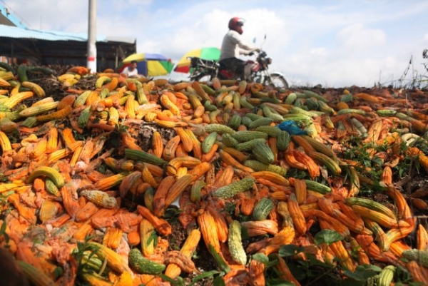 在广东省佛山市高明区,苦瓜、茄子、白瓜等蔬菜,严重滞销。苦瓜最甚,有时一斤5分钱的贱价都没人要。茄子、白瓜一斤的收购价也仅有2角钱。而去年,这些蔬菜的市场行情却非常好,苦瓜的收购价每斤超一元。一名女收购商在分拣出质量合格的苦瓜,每天她要倾倒掉2000斤以上的烂苦瓜。