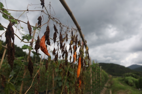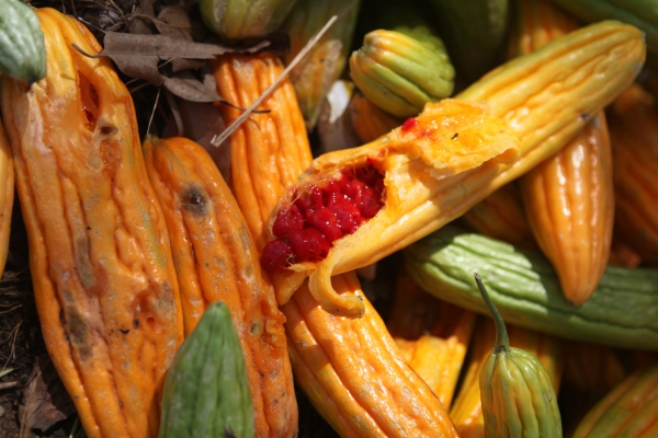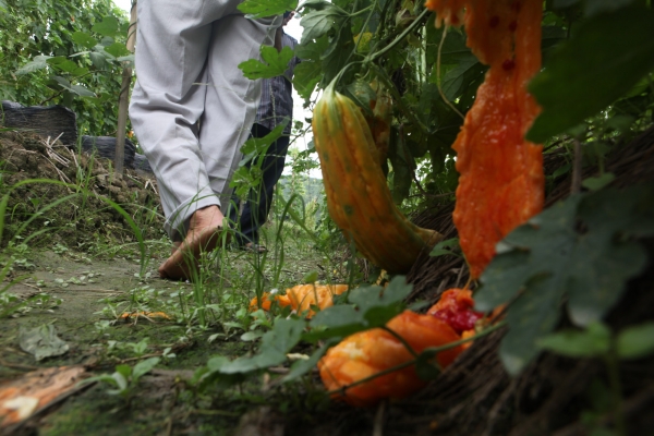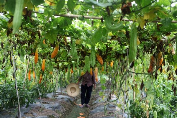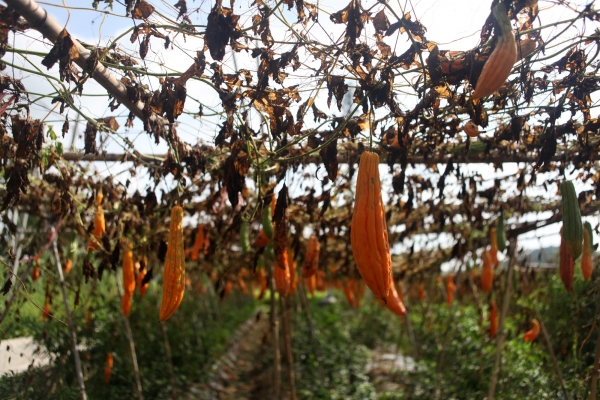 大多数的苦瓜已过分成熟,变成通体的橙黄色,挂在菜园里渐渐腐烂。