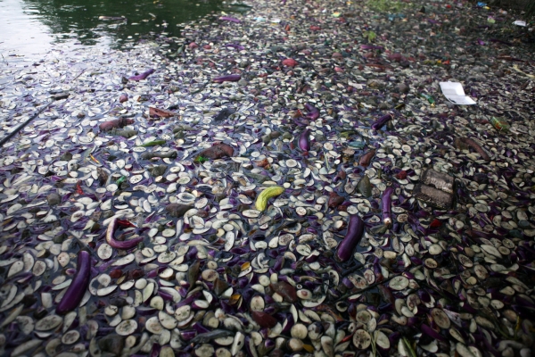 卖不出去的茄子被扔到鱼塘中喂养塘虱鱼。