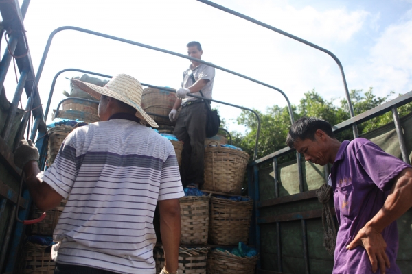 一名在更合镇高村的苦瓜收购商说,她们每天收购1万斤以上的苦瓜,其中挑出扔掉的烂苦瓜就超过2000斤,这样的情况已经持续了1个月。收购商在搬运茄子,由于市场价格被压低,收购商称自己也是受害者。