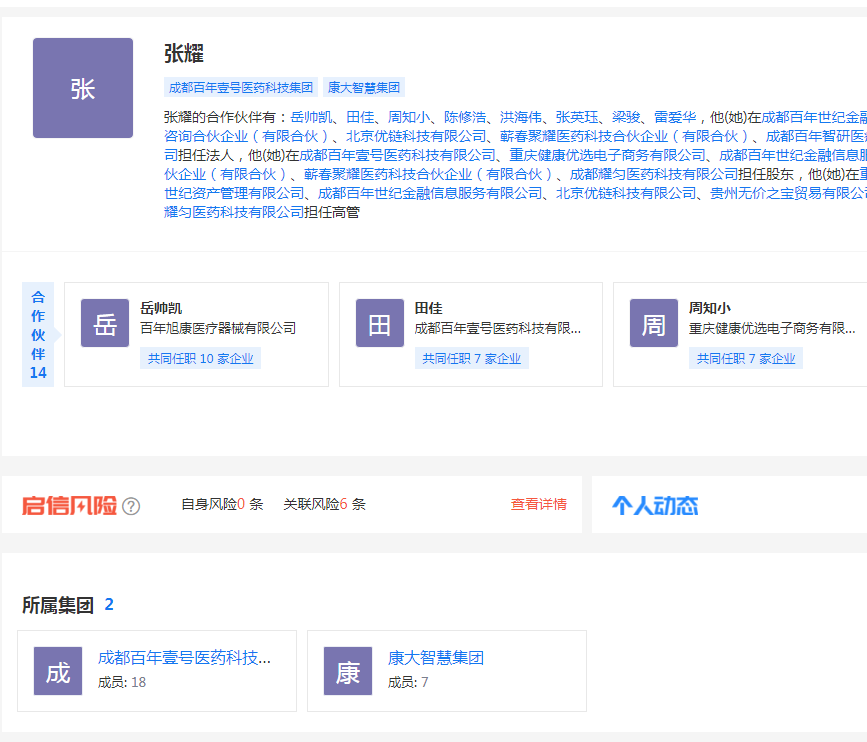 耀匀医药的股东张耀,与百年壹号目前的大股东张耀同名(启信宝显示为同一人)。同时,耀匀医药的监事张舰戈也与武汉百年奥斯科医疗器械有限公司控股股东同名(启信宝显示为同一人),后者总经理雷爱华与百年旭康医疗器械有限公司(以下简称百年旭康)股东雷爱华同名。一则百年壹号的招聘信息中称,百年旭康与百年壹号同由“百年聚集团”成立。