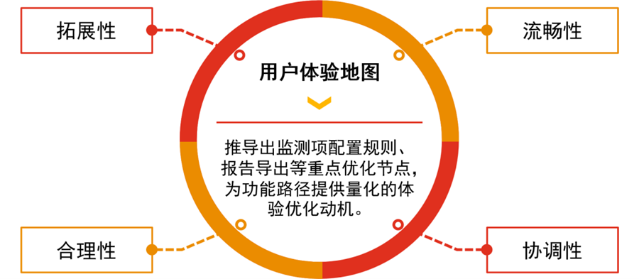 以某金控集团经营可视化项目为例,在设计初期,团队对各业务进行全流程、多触点的梳理及指标归因评分,结合关键节点进行指标评测。融入用户体验地图中的场景感知,确定流畅性、拓展性、合理性、协调性等各指标的分值权重,引入分数排名机制。最终推导出监测项配置规则、报告导出等重点优化节点,为功能路径提供量化的体验优化动机。