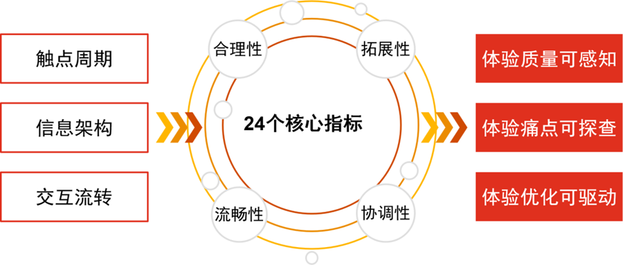 基于此洞察并结合项目实践经历,普华永道数字化产品创设服务团队建立了触达产品全生命周期的体验管理体系:DMS(Digital-design Management System)。作为一套面向数字化产品的专业体验管理体系,DMS从触点周期、信息架构和交互流转三个维度,基于24个核心指标,实现体验质量可感知、体验痛点可探查、体验优化可驱动。