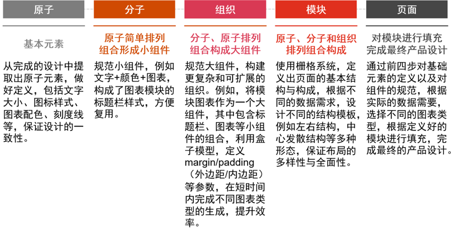 团队基于Atomic Design(原子设计理论)构建了一套完备的组件形态,以支撑更加灵活的业务场景。将功能及视觉表达中的元素进行拆解、归纳和重组,并基于可被复用的目标,以原子、分子、组织、模块、页面这五大元素,通过多维度组合来输出整个设计方案。组件库的优势在于能用规范化的数据维度帮助业务有效迭代,覆盖To B和To C业务中的工作台、列表类、表单类、详情类、结果类等8大场景。灵活的组件接口能实现“从需求设计”到“开发上线”的端到端模式,提供从基础元件管理到上层应用开发全流程的支撑,高效赋能业务发展。