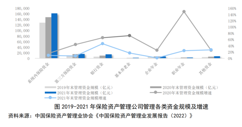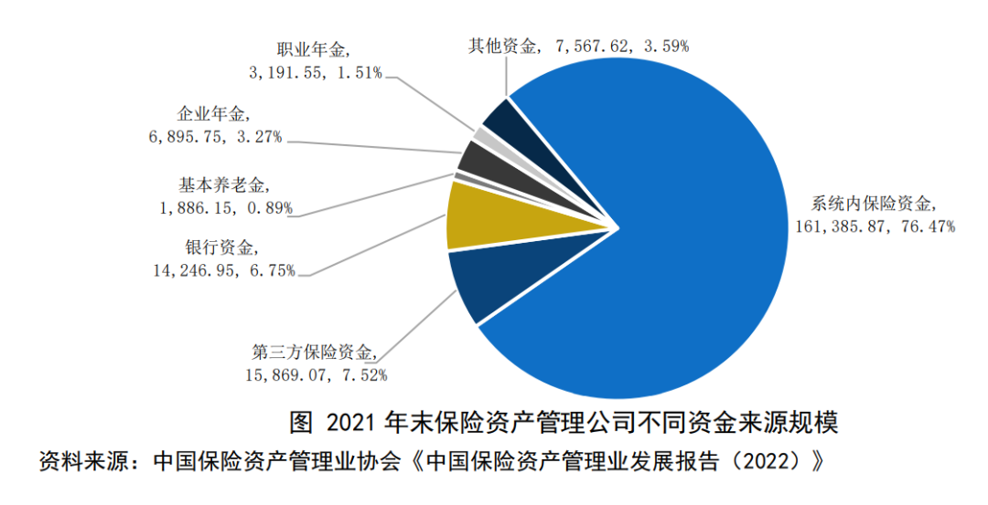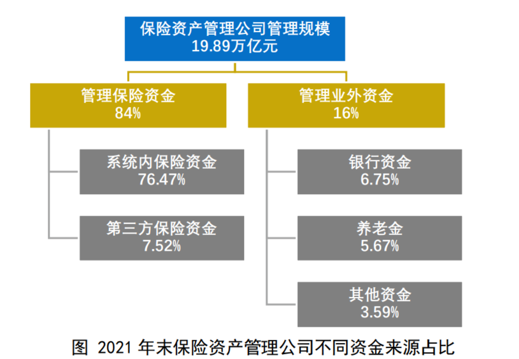 数据显示,截至2021年末,在保险资金方面,管理系统内保险资金16.14万亿元、第三方保险资金1.59万亿元,合计17.73万亿元;在业外资金方面,管理银行资金1.42万亿元、养老金(含基本养老金、企业年金、职业年金)1.2万亿元、其他资金0.76万亿元,业外资金合计3.38万亿元。