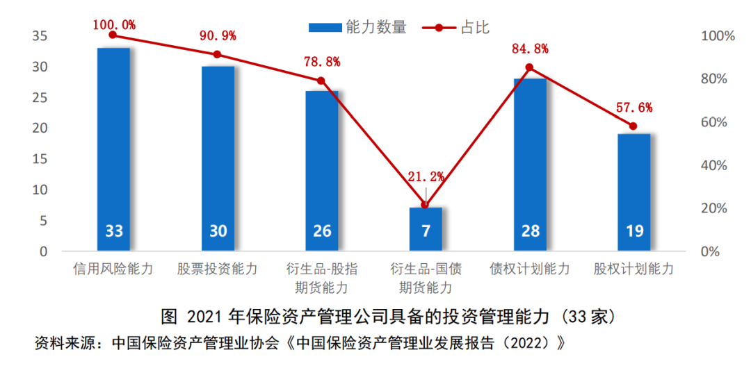从各公司投资管理能力建设情况来看(数据不包含2022年首次披露情况),披露全部五类6项投资管理能力的公司有7家,占比21.21%;披露全部五类 5项投资管理能力(不包含衍生品-国债期货能力)公司10家,占比30.30%;披露四类投资管理能力的公司7家,占比21.21%。