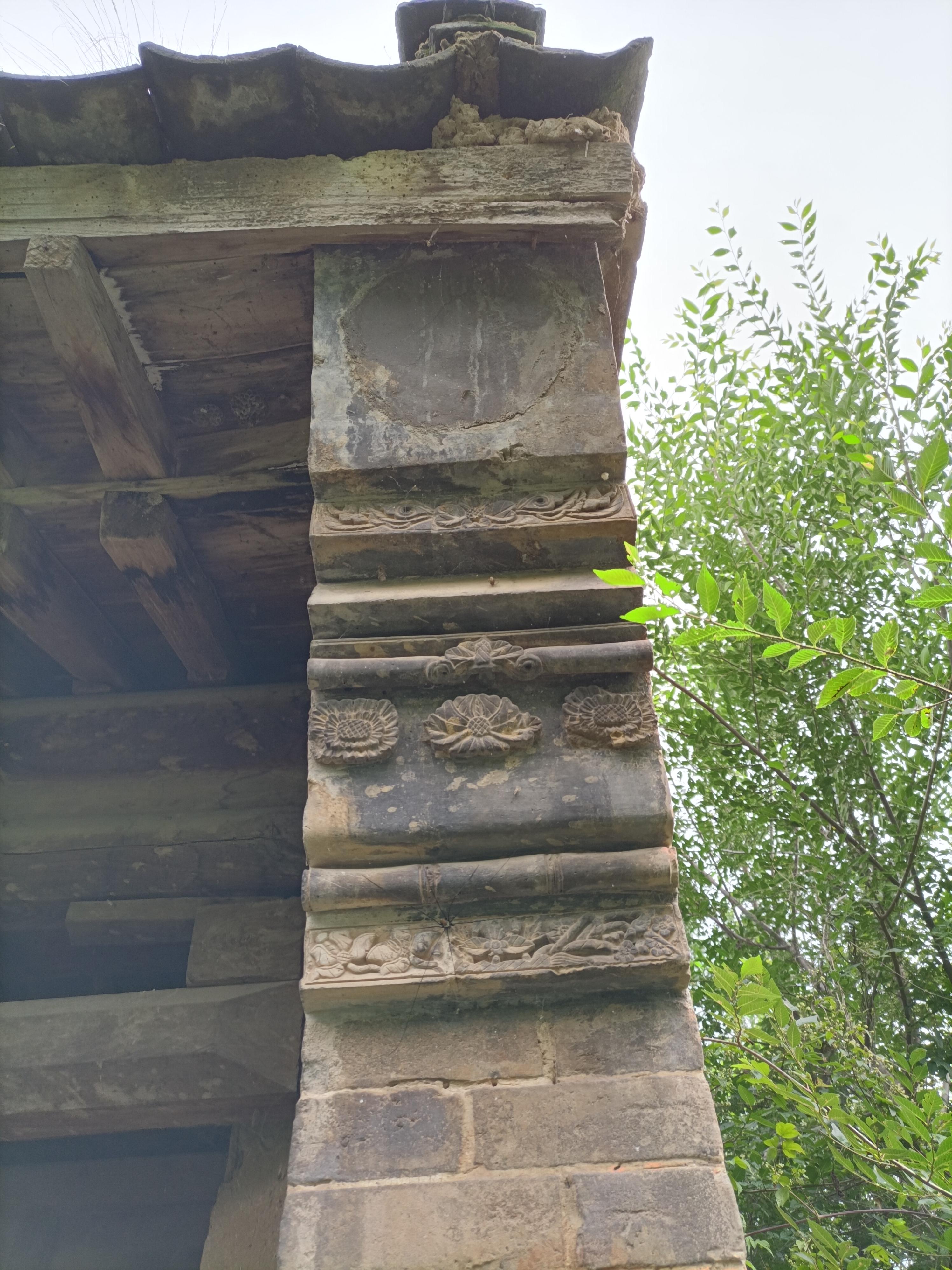一家上中农家的门楼(图6),两侧马头墙为青砖垒就(图7、8),上部有精美的砖雕图案。其中最精彩的部分圆形砖雕,被挖走了,只能用水泥糊上。