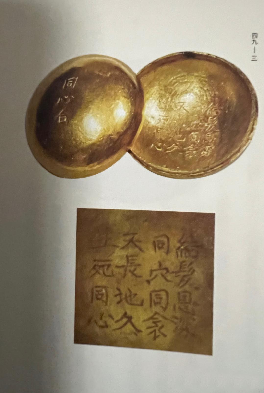 ”江苏吴县毕沅幕出土金盒一枚则是个性化的制作,盖面镌’同心合‘三字,盖里两行八字’状元毕沅‘‘夫人汪得‘。内底为’结发恩深,同穴同衾;天长地久,生死同心‘十六字。内置’结发‘。”