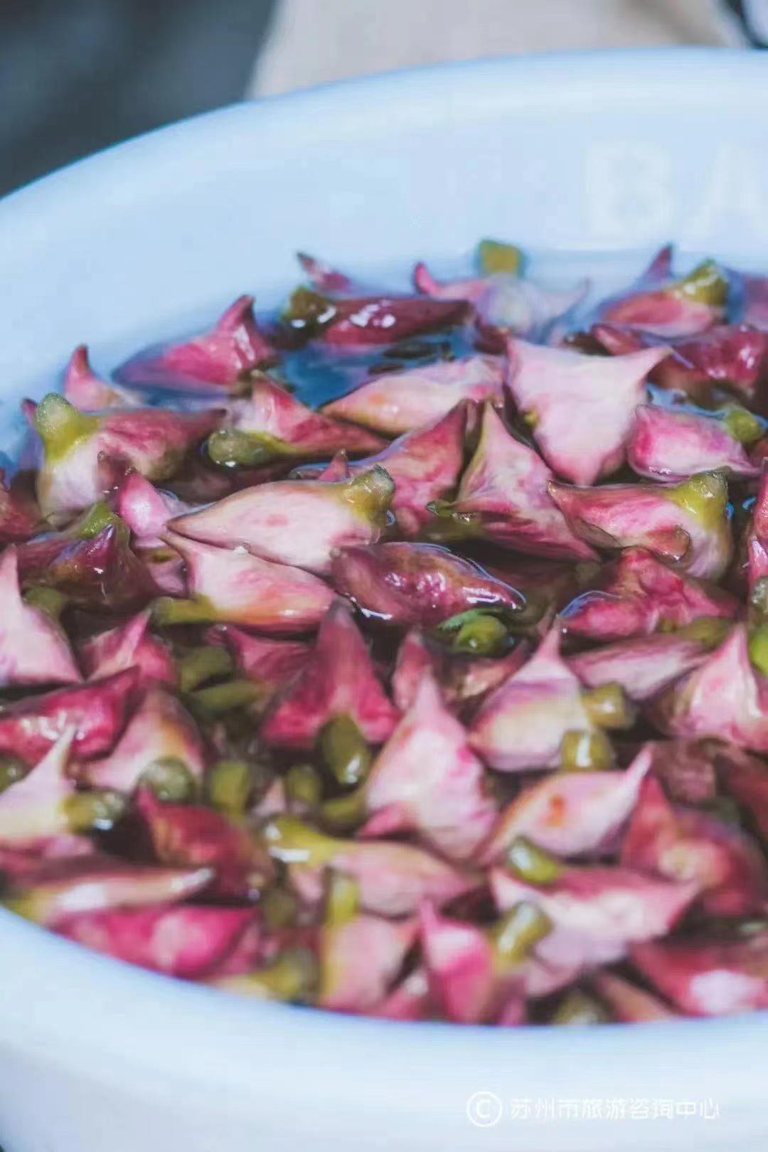 鸡头米是水生植物,叶子似荷,茎生芒刺,夏天开紫花,初秋收获其实,釆挖辛苦异常。鸡头米有五谷之甘,既是粮食,也是一味中药,为食补佳品。以姑苏城南黄天荡所产,尤为闻名,称“南荡鸡头”。鸡头米可以炒食,若荷塘小炒;可以煮汤甜食,若百合莲子鸡头米。鸡头米磨成粉,可制成芡实糕,同里、周庄、震泽、甪直等水乡古镇,多有售卖。资深老饕认为,鸡头米以食其本味为上选。