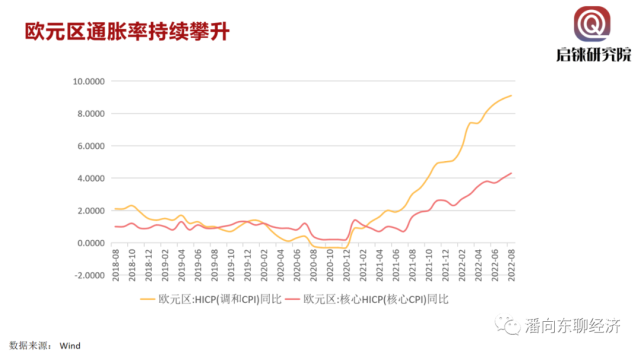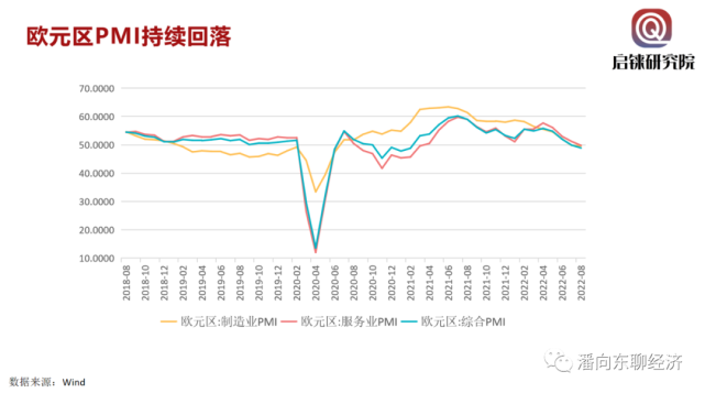 自2021年以来,欧元区制造业和服务业PMI也都成下降趋势,8月制造业PMI录得49.6,跌破荣枯线,创下18个月以来新低。在能源危机的推动下,欧元区7月通胀率同比高达8.9%。
