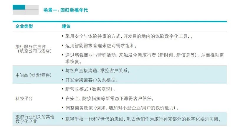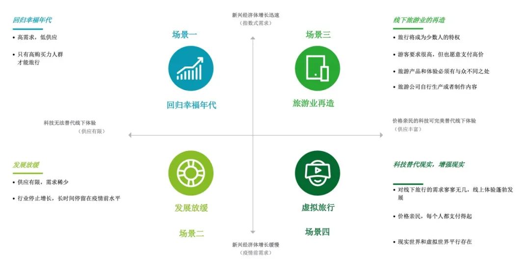 【场景一/回归幸福年代】在该场景下,随着中产阶级的不断扩大,对旅游的需求也不断壮大,然而旅游行业的有限供应将大幅推高旅游产品价格。住宿、餐饮、休闲活动等供应的扩张依然无法满足所有需求,此时,只有愿意支付高价的消费者才能去最热门的目的地旅行。