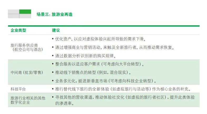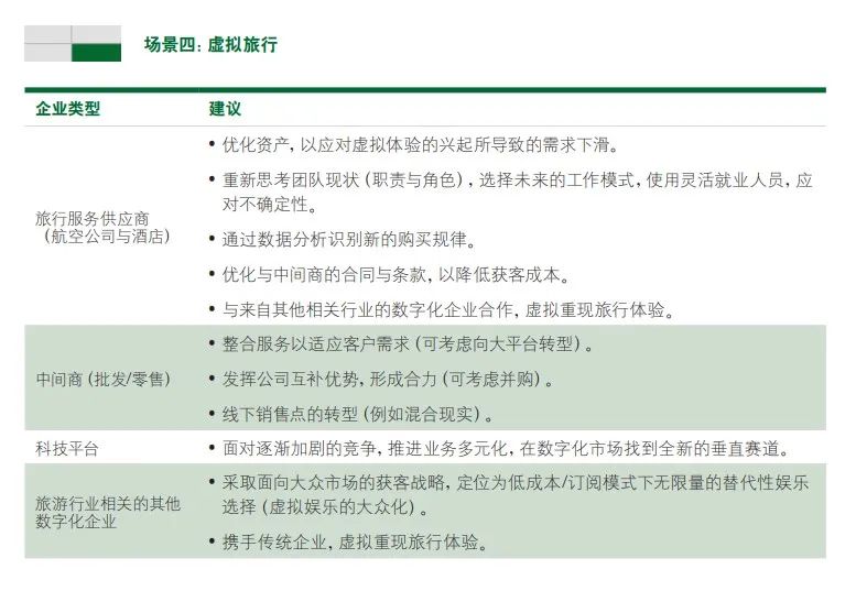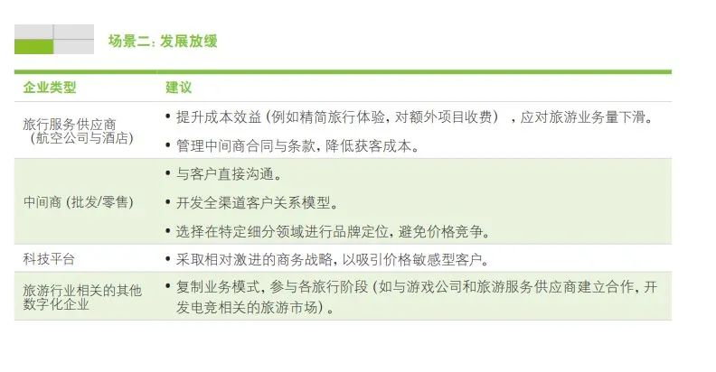 【场景四/虚拟旅行】该场景下,由于新兴国家增长缓慢,旅行需求保持稳定,而科技发展使得以亲民的价格模拟线上体验成为可能。届时,实体世界将与线上世界平行并存,而行业玩家需要同时争夺这两个世界的业务。玩家需要给出具有竞争力的价格,在线上和线下提供最佳体验,这将引发更大规模的行业整合,中小型玩家预计将被迫离场。而领先的行业玩家可能会利用其巨大的客户基础,实现业务转型,更加聚焦于产品 与游客体验的个性化。