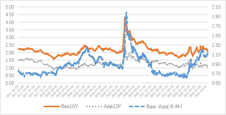 从整个市场投资者风险偏好来看,单从风险溢价补偿来看,目前穆迪Aaa和Baa债券的风险溢价是下降的,似乎投资者风险偏好上升,这是一个错觉,主要原因是在美联储激进加息的作用下无风险利率上升得太快了,美联储过激的货币政策挤压了市场风险溢价空间。如果从穆迪Baa债券和Aaa债券收益率差来看,投资者的风险偏好是上升的。从今年3月份美联储加息以来两者之间收益率差明显扩大,截至9月22日两者之差是1.13个百分点,明显高于2017-2019年的日均0.85个百分点(图4)。虽然穆迪Baa债券和Aaa债券收益率差还远不及2020年3月全球金融大动荡时期,但从上涨趋势来看,国际金融市场投资者的风险偏好正在发生变化。