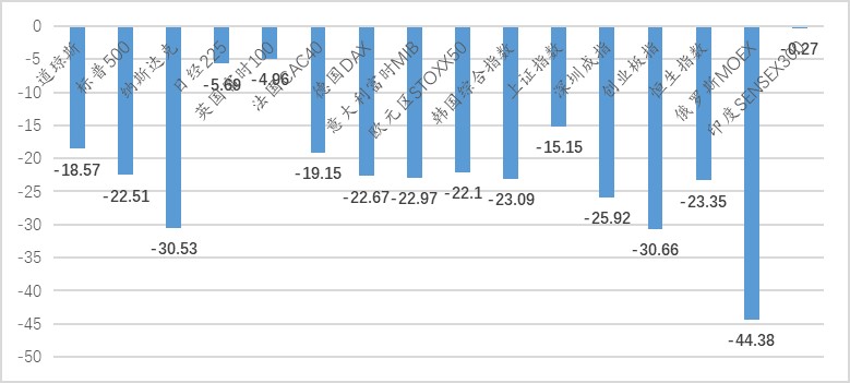 除了极少数的股市指数上涨外,如富时新加坡海峡指数(上涨3.31%)、印尼综指(上涨9.07%),全球股市基本呈现出了集体下跌的态势,但下跌的幅度差异巨大。