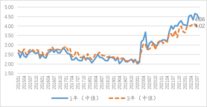 但从短期通胀预期来看,依然存在高度不确定性,这种不确定性决定了货币政策持续紧缩的确定性。图2显示今年8月美国经济中1年期通胀预期不确定性指数为4.36,处于历史的高位区域,即使是3年通胀预期不确定指数也是处于历史的高位区域。