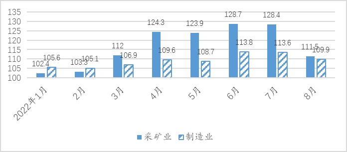 图1、今年1-8月采矿业和制造业进口价格指数(上年同期=100)