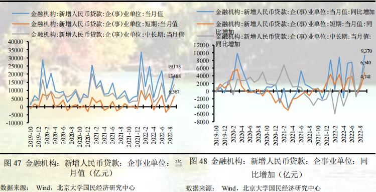 2022年9月新增人民币贷款2.47万亿元,同比多增8100亿元。其中,短期贷款9605亿元,同比多增4560亿元;票据融资-827亿元,同比少增2180;中长期贷款16944亿元,同比多增5329亿元。可见,短期贷款和中长期贷款均大幅改善,共同支撑本月信贷规模。进一步分部门看,9月居民户贷款6503亿元,同比少增1383亿元,企事业单位贷款19173亿元,同比多增9370亿元,显示企事业单位信贷规模大幅改善,对本月信贷规模形成支撑,而居民户信贷规模仍偏弱,对本月信贷规模构成拖累。我们预测9月新增人民币贷款1.75万亿元,低于实际7200亿元,但同比多增维持一致,主要低估了季末短期贷款的冲量作用。