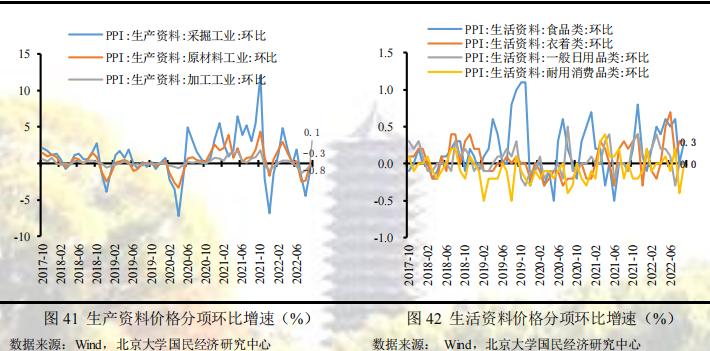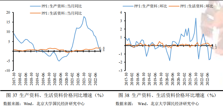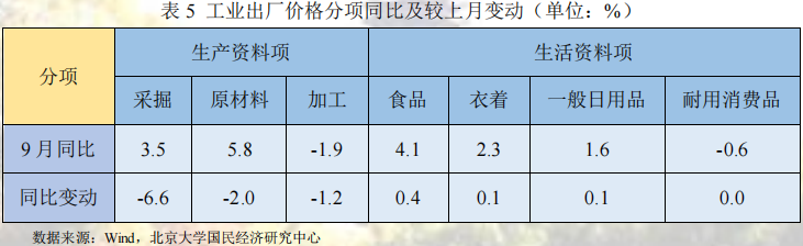 9月份,前期保供稳价政策持续,各地区各部门高效统筹疫情防控和经济社会发展,保障重点产业链供应链畅通稳定,国内部分能源和原材料供需矛盾有所缓解,但受国际大宗商品价格波动传导和国内需求偏弱等多种因素影响,工业品价格走势整体下行,工业品价格环比下跌幅度收窄,同比下行幅度收窄,具体而言:受工业上游原材料、能源品等价格回落影响,生产资料价格继续回落;受需求回温及上游工业传导影响,生活资料价格平稳增长。